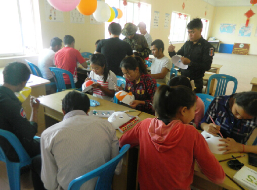 春節系列活動從1月28日陸軍學院漢語中心“春聯與剪紙文化講座”開始。孔子學院院長謝莫尼勒(Chea Munyrith),中方院長帥式毅也開始了他們的春節文化活動的行程,陸軍學院90公里,大島洪森中學80公里,西港高中220公里、棉芷大學中文系300公里,吳哥高中孔子課堂300公里,但各個教學點的精心準備的春節文化系列活動驅除了兩位院長旅途的疲勞。