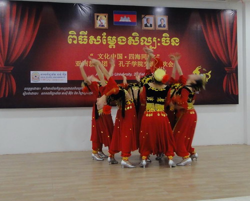 2月27日(農(nóng)歷正月初九),"文化中國四海同春"亞洲藝術(shù)團利用到訪柬埔寨的機會,與柬埔寨王家研究院孔子學(xué)院師生、亞歐大學(xué)學(xué)生舉行現(xiàn)場交流,精彩的表演贏得了一陣陣掌聲,給在場師生帶來了一個歡樂愉快的下午。