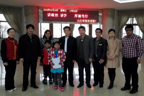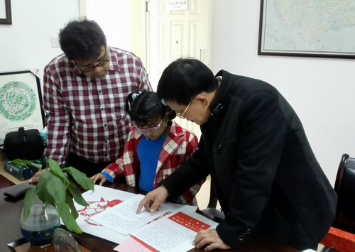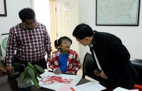 3月18日下午,在校行政樓402辦公室,熱烈上演著我校外籍教師Raza的女兒Isna拜師學藝的一幕。九江市外專局副局長詹冬龍專門陪同瑞昌剪紙大師朱撲光教授前來九江學院參加收徒儀式。參加儀式的還有國際處的王賢淼副處長、吳滔主任以及外籍教師Raza一家。