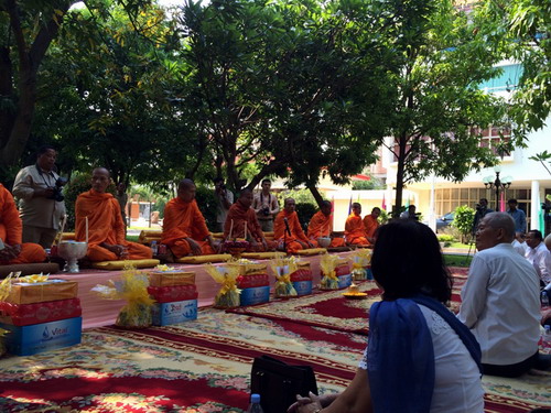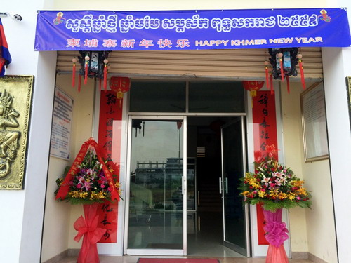 柬埔寨王家研究院孔子學院收到了東南亞電信的祝賀花籃,祝賀孔子學院全體師生柬新年快樂。4月9日,孔子學院亞歐大學中文系的全體漢語教師參加了該校組織的柬埔寨新年體驗活動,他們和中文系的學生一起唱歌、跳舞,觀看了晚宴上的精彩表演,中文系學生的中文歌曲和武術表演掀起了活動的高潮。帥式毅應邀參加活動,并向亞歐大學董事長董良(Duong Leang)及校長謝索皮(Chea Sopheap)及全體亞歐大學師生祝賀新年。4月10日,帥式毅和張文峰應邀參加了參議院舉行的新年活動,9名僧侶誦經(jīng)祈福,孩子們表演了傳統(tǒng)的柬埔寨歌舞。
