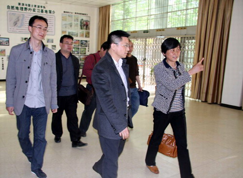 李松志向客人介紹了我校旅游與國土資源學院自然地理和野外實習基地的情況,重點介紹了學院針對山、江、湖學科建設展開的野外實習安排,包括廬山第四紀冰川地貌實習、廬山氣象、植物和土壤觀測,長江中游地質地貌實習、鄱陽湖沙山-海濱地質地貌實習等。朱副書記對我院的實習基地建設表示充分的肯定。