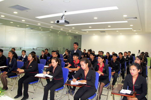開班儀式結束之后,大家共同觀看了王家研究院孔子學院五年來建設發展的歷程。來自吳哥高中孔子課堂的教師志愿者及全體吳哥免稅店漢語班學員約100余人參加了儀式。