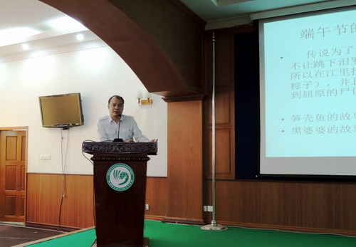 帥式毅做了《中國傳統(tǒng)節(jié)日介紹——端午節(jié)》的講座。他首先介紹了端午節(jié)的由來、風(fēng)習(xí)及慶祝活動,同時用比較的方式聯(lián)系了柬埔寨的節(jié)慶活動。他說,中方承辦院校九江學(xué)院就是屈原故事中楚國的最東邊,曾舉辦過國際龍舟賽;中柬兩國文化交流源遠(yuǎn)流長,兩國風(fēng)習(xí)有很多相同的地方。希望學(xué)員們通過參加中國文化活動來加強(qiáng)漢語學(xué)習(xí),也希望學(xué)員們在將來能用中文把柬埔寨的傳統(tǒng)節(jié)日柬新年、亡人節(jié)、送水節(jié)等介紹給中國朋友。