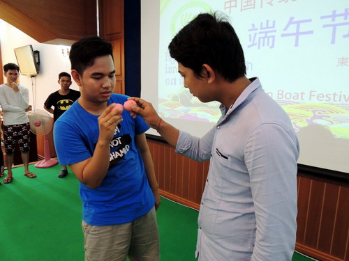 孔子學(xué)院為本次中國傳統(tǒng)節(jié)慶文化活動做了精心的安排,整個活動精彩紛呈,學(xué)員參與度高。不僅有端午節(jié)文化講座、古箏曲演奏、茶藝表演、微電影《我的端午節(jié)》,還有漢語教師志愿者現(xiàn)場指導(dǎo)編五色絲手鏈、畫雞蛋、碰雞蛋及端午節(jié)知識競答等互動環(huán)節(jié)。