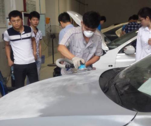隨后同學們參觀了汽車售后服務區和噴漆車間,觀看維修工給一部待噴漆的汽車引擎蓋打磨,并提出不同的維修方案。