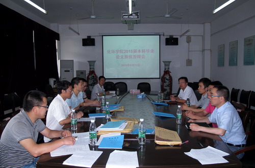 6月11日上午,化環學院在向學樓五樓會議室組織召開2015屆本科畢業論文(設計)推優答辯會。參與推優答辯的評委有:化環學院院長嚴平、副院長楊期勇、孫德四及各論文答辯小組組長。