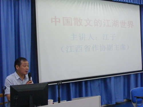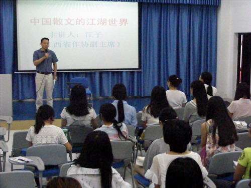 應文傳學院邀請,6月18日下午,江西省作協(xié)副主席江子來到文友樓205,為文傳學院漢語言文學專業(yè)師生和浪井文學社成員帶來了一場精彩的學術(shù)報告——“中國散文的江湖世界”。報告會由文傳學院副院長江臘生主持。