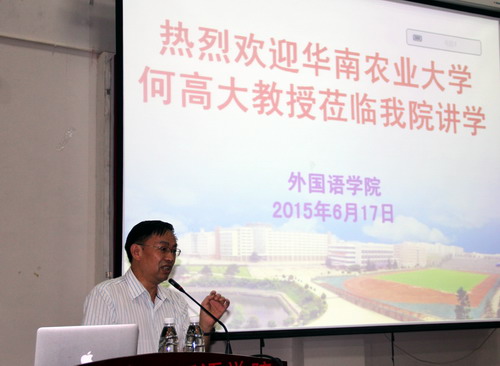 6月17日,應外國語學院邀請,國內(nèi)知名英語專家、華南農(nóng)業(yè)大學教學名師、何高大教授為教師作了“外語教育技術(shù)發(fā)展趨勢——以翻轉(zhuǎn)課堂、微課為例”的學術(shù)講座,韓琨院長主持學術(shù)講座。教務處副處長許禮生、外語副院長柴克清及教師到場聆聽了報告。