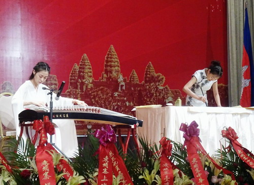 慶典儀式上當(dāng)然少不了孔子學(xué)院師生的中華文化展示。漢語教師志愿者宋亞洲老師的武術(shù)精彩絕倫,楊黛羲老師的古箏似高山流水,樊瑞娟老師的書法蒼勁有力。樊瑞娟現(xiàn)場書法后,將寫就的“中柬友誼萬古長青”贈予副總理蘇慶親王,以表達(dá)對中柬友誼的美好祝愿,蘇慶親王非常愉快地和孔子學(xué)院師生們合影,他對謝莫尼勒院長說,孔子學(xué)院師生的表現(xiàn)很好,要繼續(xù)加大在柬埔寨的漢語推廣力度。孔子學(xué)院贈送的“以中國情懷、興商會事業(yè)”的對聯(lián)給高華會長帶來的是驚喜。王家研究院孔子學(xué)院亞歐大學(xué)中文系的學(xué)生們也依次帶來動聽的中、柬文歌曲串燒,獲掌聲不斷。