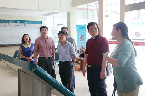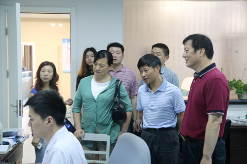 隨后,廬山區人民醫院胡小明院長一行在張院長、張書記的帶領下,參觀了臨床醫學院/附屬醫院心內科介入室、消化內鏡中心、新門診樓、磁共振室、休閑茶吧、營養食堂以及骨科、兒科、產科、神經內科病區和VIP病房等處。每到一處,一行人都仔細了解,紛紛感嘆臨床醫學院/附屬醫院變化之大,設計規劃之用心,表示對附屬醫院的發展勁頭充滿了信心,對兩院合作共贏充滿了期待。