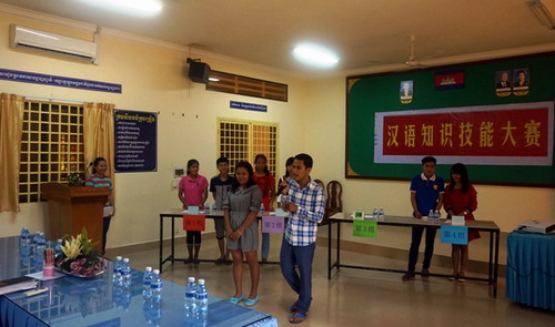 此次比賽包括問答題、聽寫題、表達題和表演題。參賽選手都作了充分的準備,現場的競爭可謂異常激烈。在知識問答環節,漢語知識、中國國情、中國文化以及柬埔寨文化一點也沒有難倒我們的選手們。表演階段,參賽選手更是集唱歌、表演于一身,充分展示了他們的多才多藝和組員之間相互配合的默契。最后的拉票環節選手們或發表小演講或說笑話逗的現場觀眾開心,卯足了勁的為自己的隊伍拉分,更是將比賽推向高潮。