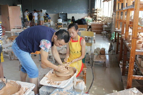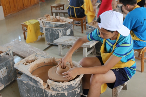 陶藝體驗當然也是學習陶瓷文化必不可少的環節。27日,大家來到陶瓷體驗區,在觀看陶瓷大師制瓷時,營員們都紛紛表示道:“這是一個簡單的活,只是捏一捏,拉一拉就行了”。但是當來到體驗區,大家坐到坯土面前都顯得手足無措。營員們分成兩組,認真聽老師講解的同時,自己也開始動手做,畢竟是第一次,大家都略顯生疏,有些營員還會把泥土濺出來,可是時間久了,部分同學掌握了訣竅,在老師的幫助下,做出來的碗盤、碟子等等,還有模有樣。但是也有些同學做的樣子不太好看,略有失望同時也不舍不棄。營員們還進行了捏土、畫坯的體驗,有些同學捏出了很多卡通人物和動物,有些同學在盤子上畫出各種各樣的花型和玩偶。在短暫的時間里,大家積極參與,最后離開時,還帶著戀戀不舍的心情,表示下次有機會過來,還要體驗一把。