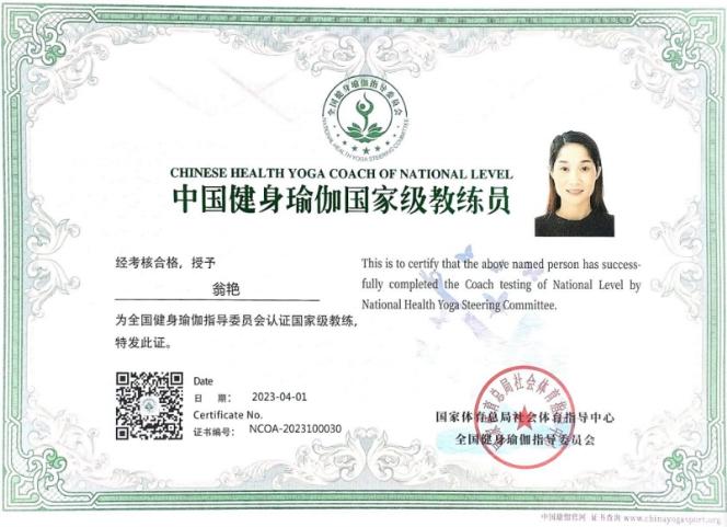 國家級健身瑜伽教練員證書