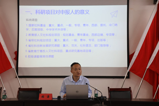 論壇的第二階段,張濤博士為圍繞“科研項目申報書的撰寫”進行了專題分享,重點講解了國家社會科學基金項目申報的具體要求與評價指標。他指出課題申報重點是選題,要將個人所長和國家所需相結合,深入結合中國式現代化進程,體現獨有的學術價值和應用價值。