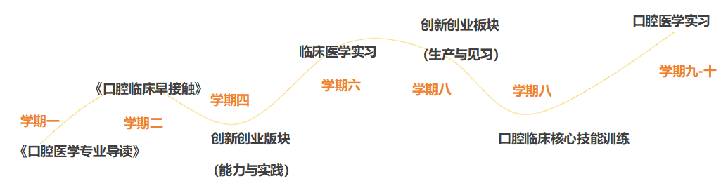 ——專業認知實踐→ 醫患溝通臨床見習→社區見習→課內實驗→課間見習→ 臨床實習→專業病例臨床見習→ 口腔臨 床核心技能訓練→ 口腔醫學實習(含口腔臨床技能強化訓練及口腔技能 OSCE 考核)。