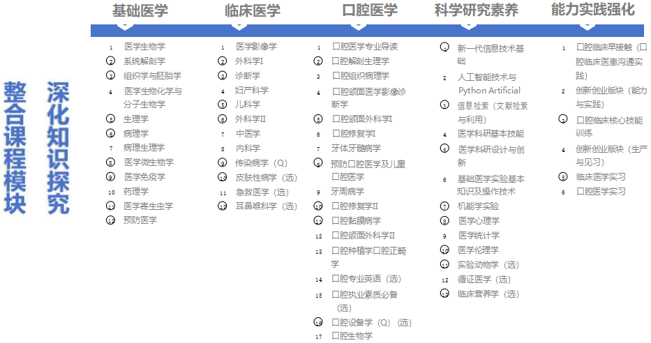 專業教育課 45 門(含專業基礎課程 17 門+專業課 28 門〈其中口腔專業課 16 門),實習共 57 周(含臨床醫學實習 12 周+口腔醫學專業臨床實習 45 周)。