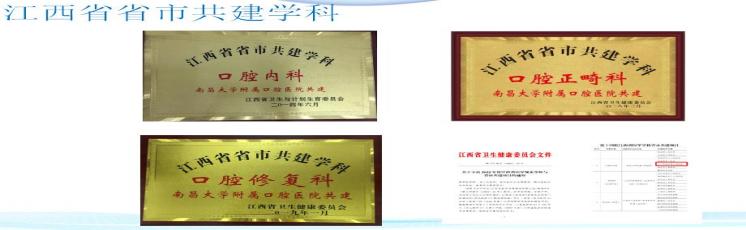 醫院是我國中西部地區兒童口腔健康預防干預項目(窩溝封閉)九江市實施定點醫院、美國國際“微笑列車 ”(唇腭 裂免費治療)贛北地區免費手術定點單位、國際唇腭裂治療基地、中南地區口腔專科醫聯體成員單位、上海交通大學醫學 院附屬第九人民醫院集團口腔修復專科聯盟合作單位、江西省“光明 ·微笑 ”工程唇腭裂治療合作定點醫院、江西省口腔 醫學會副會長單位、九江市口腔醫學會會長單位、九江市口腔質控中心、國家級“ 口腔全科 ”住院醫師規范化培訓基地、 九江市名醫工作室( 口腔科)、九江市口腔專科聯盟理事長單位。