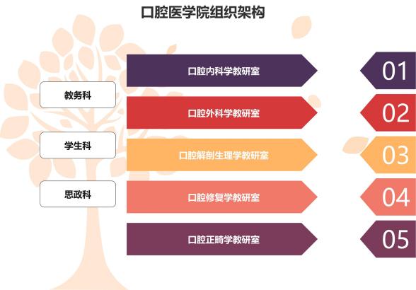 組織架構:口腔醫學院的教學管理架構包括教務科、學生科、思政科及 5 個教研室( 口腔內科學、口腔修復學、口腔 正畸學、 口腔外科學、 口腔解剖生理學)。