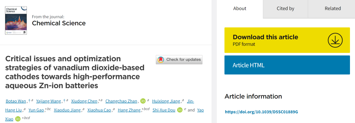 近日,在化學化工學院陳修棟教授團隊的精心指導下,我校材料化學專業A2341班萬博濤同學以第一作者身份,在《Chemical Science》(化學科學)上發表題為“Critical Issues and Optimization Strategies of Vanadium Dioxide-Based Cathodes Towards High-Performance Aqueous Zn-Ion Batteries”的綜述性學術論文。