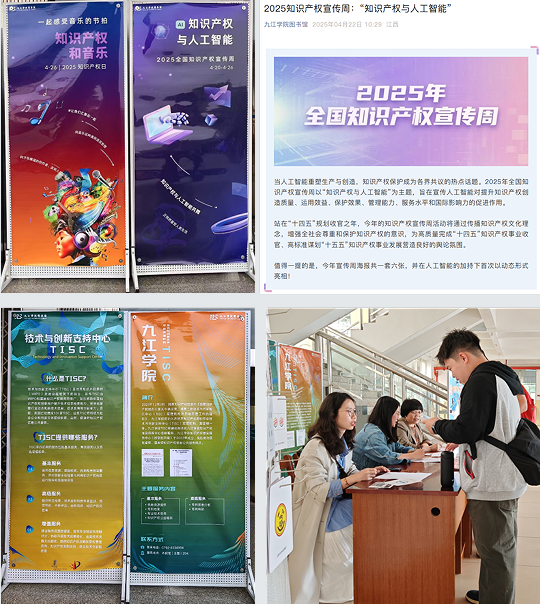 為迎接第25個世界知識產權日及全國知識產權宣傳周,在九江市市場監督管理局(知識產權局)的指導下,學校知識產權信息服務中心(掛靠圖書館)精心策劃并開展了一系列形式多樣、內容豐富的宣傳活動,通過線上線下聯動、師生共同參與,在校園內掀起“尊重知識、崇尚創新”的熱潮,進一步強化了知識產權保護意識。