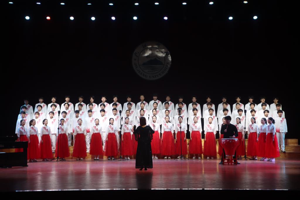 為深入學(xué)習(xí)貫徹落實黨的二十大精神,進一步弘揚“愛國、進步、民主、科學(xué)”的五四精神,引領(lǐng)青年學(xué)子賡續(xù)紅色血脈、勇?lián)鷷r代使命,4月27日晚,由九江學(xué)院學(xué)生工作處、團委主辦的以“紅歌鑄魂·青春飛揚”為主題的五四青年合唱比賽在學(xué)校大禮堂舉行。校黨委委員、副校長吳維勇出席活動并為獲獎單位頒獎。學(xué)校相關(guān)職能部門負責(zé)人、二級學(xué)院黨政負責(zé)人、師生代表1000余人共同觀看這場青春盛宴。