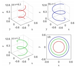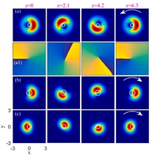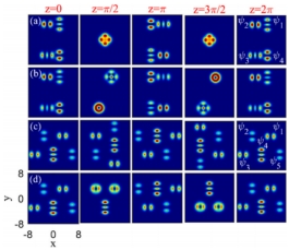 2.首次發現了攜帶多個渦旋相位的孤子可以在拋物勢阱中穩定傳輸,而且單渦光束具有不對稱的旋轉模式和螺旋傳播軌跡。
