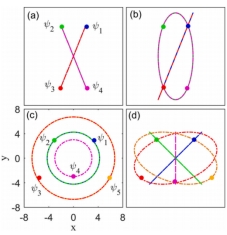 1.研究具有離軸和啁啾參數的厄米高斯孤子,在拋物勢阱中的傳輸特性。根據啁啾參數的不同,可以呈現三種不同的傳播狀態(包括蛇形、橢圓和圓螺旋軌跡)。幾個厄米孤子可以組成孤子陣列,并能呈現不同傳輸變化。