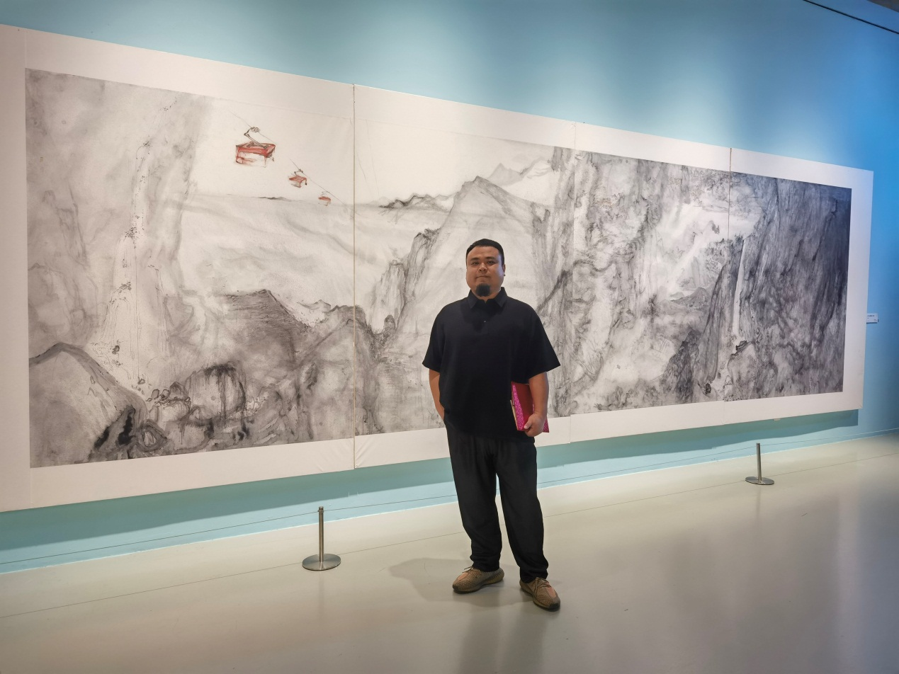 建工學院教師何微畢業于中國藝術研究院,此次獲獎作品為水墨巨制《廬山煙雨浙江潮》,以雨中廬山為母題,將如琴湖、五老峰、牯嶺街、三疊泉等標志性景觀熔于一爐。畫面隨煙雨氤氳鋪陳,墨色濃淡間忽明忽暗,既見潑墨灑脫之姿,亦含筆線精微之妙,營造“可居可游”的沉浸式山水意境。作者以傳統水墨為骨,融入當代審美,通過虛實相生的章法,讓廬山的靈秀與煙雨的朦朧渾然一體,既具地域文化特質,亦顯文人畫“外師造化,中得心源”的精神追求,是其深耕本土自然與人文的代表性創作。