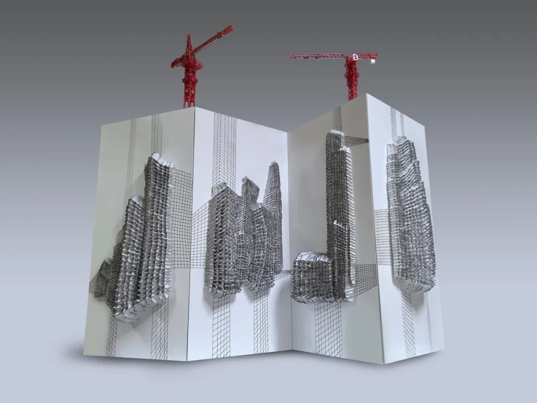 藝術學院教師譚丹武畢業于中央美術學院,其獲獎作品陶瓷雕塑《大國筋骨——城市天際線》是其近幾年“筋骨”系列作品的延續。靈感源自陶瓷印坯工藝內部的支撐結構,稱之為“筋”,這種骨架結構與現代建筑中的鋼筋水泥具有相同的功能。作品以中國城市中的現代建筑為創作對象,旨在呈現新中國成立以來在城市建設中取得的矚目成就,見證大國建造和中國速度的輝煌成果。頂部的塔吊加入了動態裝置,能更生動形象地展現出建設過程的活力與動態。創作采用手捏成型的方式,這能更好地表現泥土本身的材料語言,通過透視線的延伸處理,加強對作品空間的想象力。作品中線條的造型語言、黑白的東方美學、留白的畫面意境、屏風的折疊效果等都展現對中國傳統藝術和審美的思考。