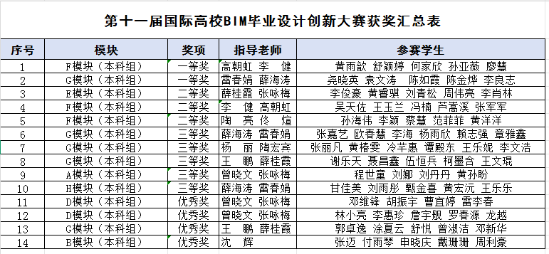 近日,第十一屆國際高校BIM畢業設計創新大賽圓滿落幕。我校建筑工程與規劃學院學子憑借卓越表現獲得全國一等獎2項、二等獎3項、三等獎5項,優秀獎4項,獲獎數量與質量均創學院參賽歷史新高。