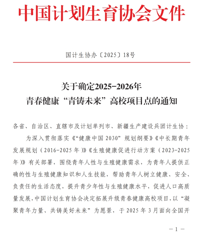 近日,中國(guó)計(jì)劃生育協(xié)會(huì)正式公布了2025-2026年青春健康“青鑄未來”高校項(xiàng)目點(diǎn)名單。我校校醫(yī)院申報(bào)的“青春健康,鑄享未來”項(xiàng)目從全國(guó)600余所高校中脫穎而出,成功入選。這是我校繼2023年成功獲批并順利結(jié)項(xiàng)中國(guó)計(jì)生協(xié)高校項(xiàng)目后,再次獲批項(xiàng)目點(diǎn),標(biāo)志著我校青春健康教育工作得到持續(xù)認(rèn)可。