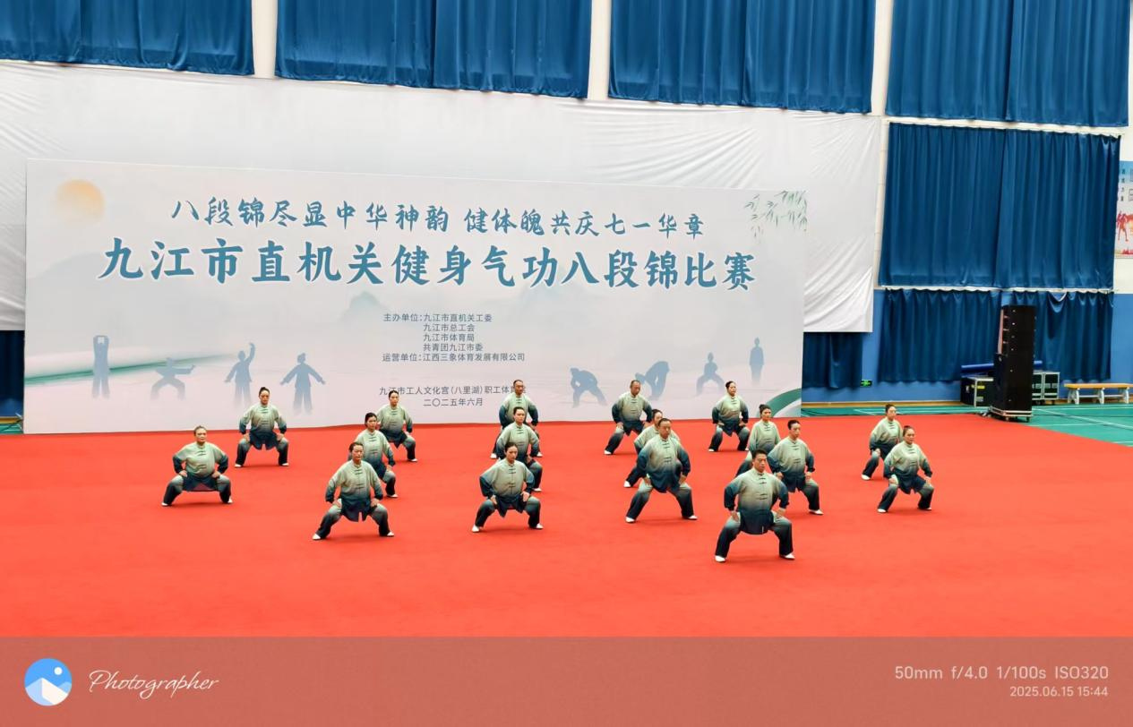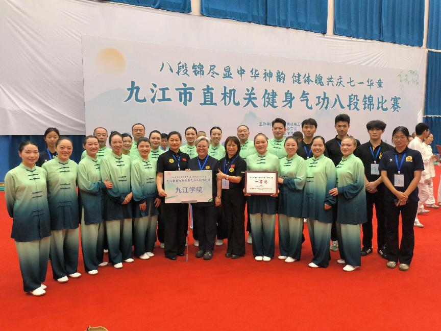 6月15日,九江市直機關健身氣功八段錦比賽在市工人文化宮職工體育館成功舉行。本次比賽由九江市直機關工委,市總工會、市體育局、共青團市委聯合舉辦,吸引了來自市直機關的36支代表隊、450余名運動員參加比賽。經過激烈角逐,我校參賽代表隊憑借出色發揮,以9.31分的高分勇奪一等獎。