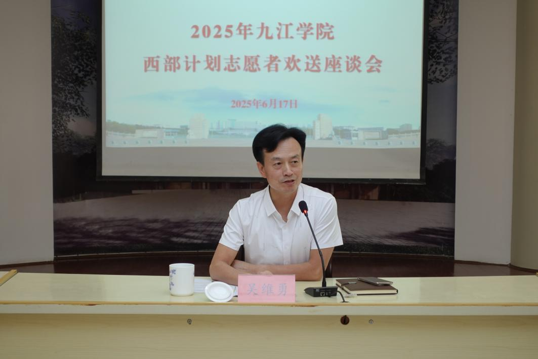 為推動(dòng)志愿服務(wù)西部計(jì)劃項(xiàng)目高質(zhì)量發(fā)展,激勵(lì)學(xué)生積極投身基層工作,6月17日上午,九江學(xué)院2025年大學(xué)生志愿服務(wù)西部計(jì)劃志愿者歡送座談會(huì)在學(xué)校行政樓一號(hào)會(huì)議室召開(kāi)。校黨委委員、副校長(zhǎng)吳維勇出席活動(dòng)并講話。
