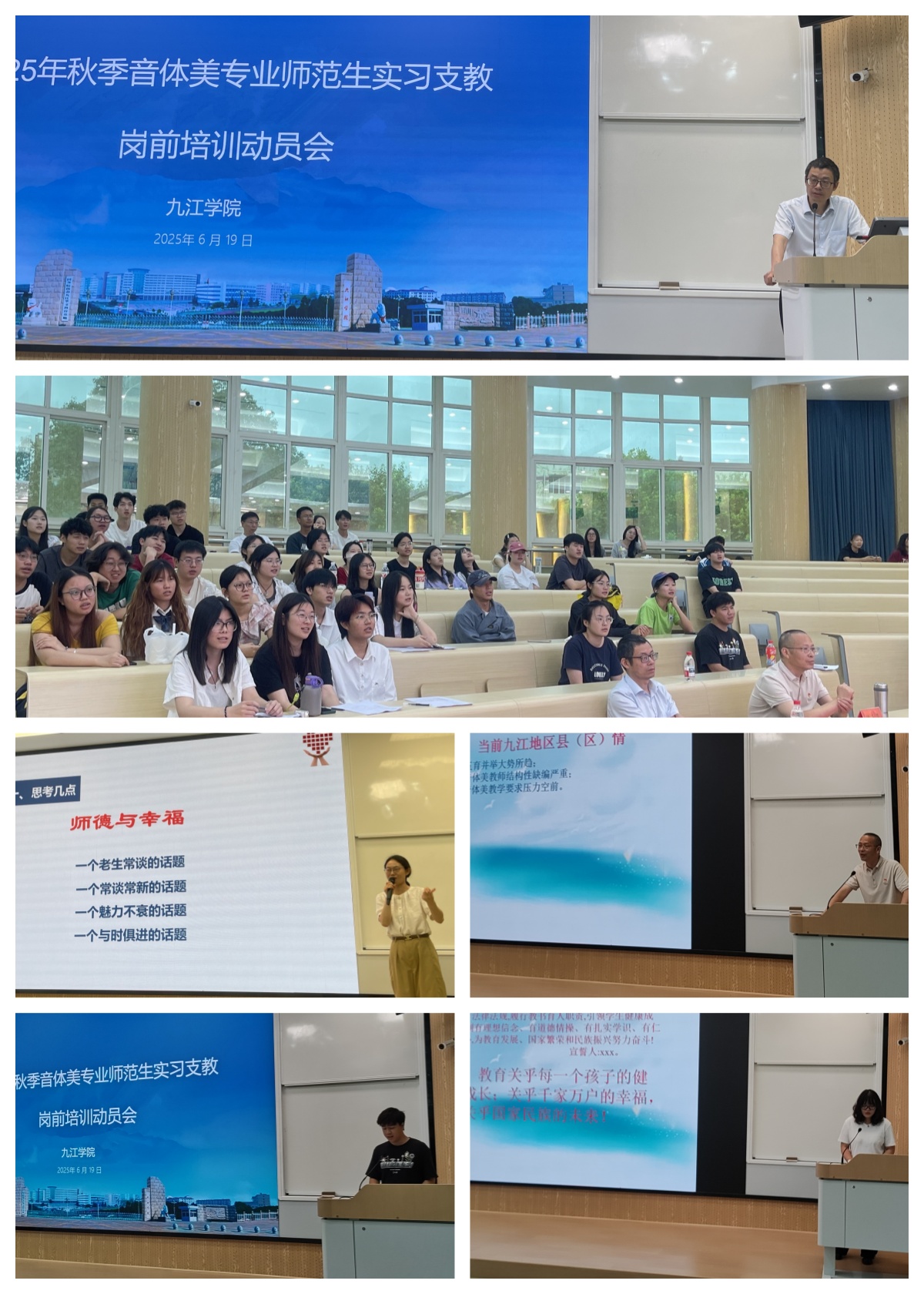 為深入貫徹落實黨的二十大精神,響應江西省教育廳關于支持農村教育發展的號召,6月19日上午,九江學院2025年秋季音體美專業師范生實習支教崗前培訓動員會在競知樓階梯教室召開。外聘專家湖口三中副校長周全、濂溪區蓮花鎮中心小學副校長胡子晏、各學院相關負責人、帶隊教師及全體支教學生參加了會議。