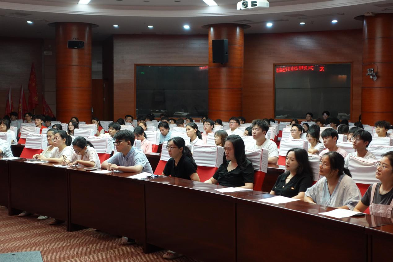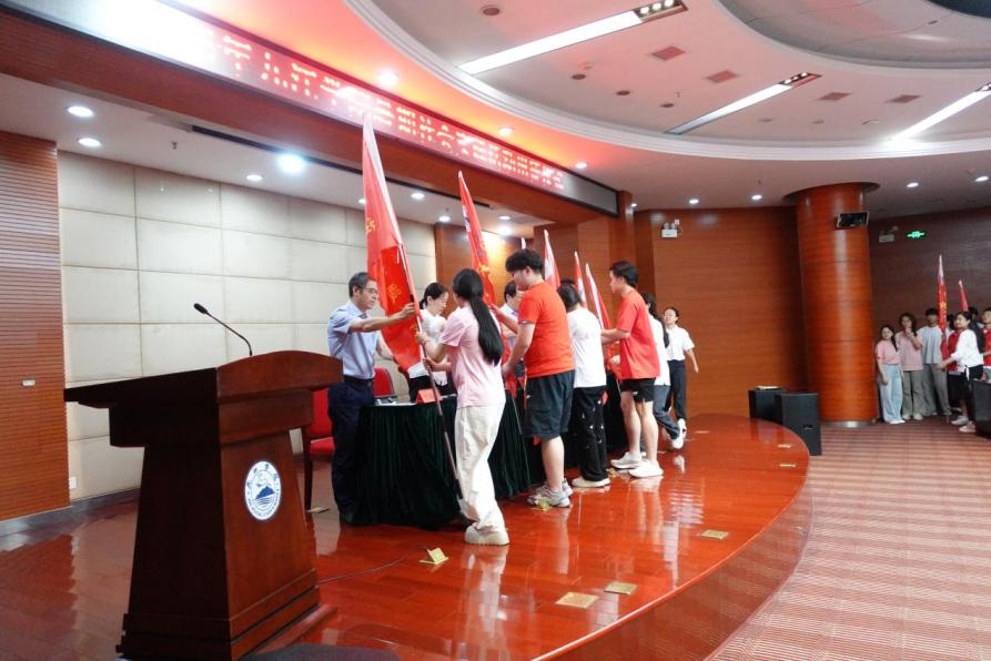 團委負責人介紹了2025年暑期社會實踐的籌備情況;社會實踐服務隊指導教師代表謝彬作了經驗分享;學生代表彭詩榮作了表態發言;與會領導為社會實踐服務隊進行授旗。