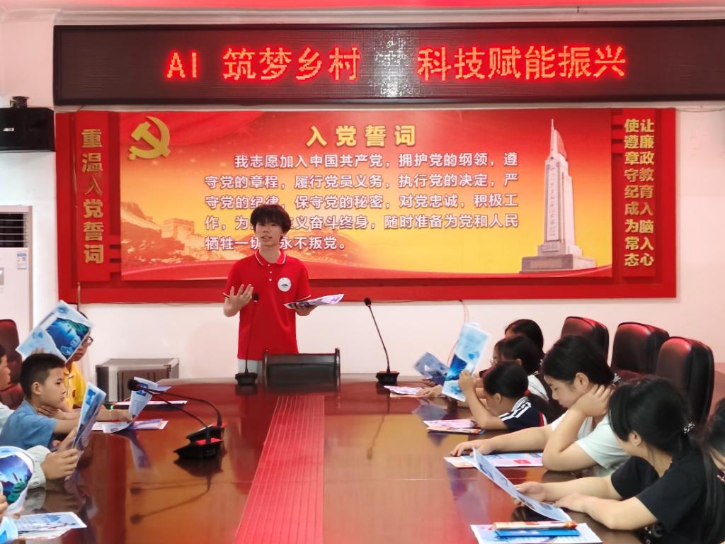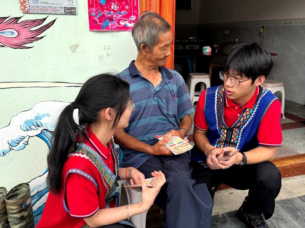 實踐隊走進金竹畬族鄉(xiāng)民族學校,與當?shù)貙W生齊唱紅歌、共跳竹竿舞,以趣味黨史課傳承紅色基因。隊員們還在鄉(xiāng)政府報告廳為留守兒童舉辦防溺水、普通話推廣及“AI賦能鄉(xiāng)村振興”主題宣講,并捐贈學習用品與文體器材。在彩繪村走訪調(diào)研中,隊員們發(fā)放了法治與防溺水宣傳手冊,以“拉家常”方式普及防詐知識,用實際行動助力民族融合與鄉(xiāng)村治理。