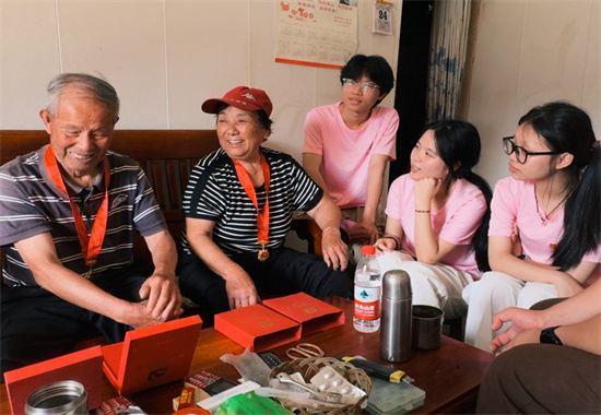 6月27日,團(tuán)隊(duì)走訪慰問(wèn)流芳鄉(xiāng)老黨員徐賢林、劉菊花夫婦。有著63年黨齡的徐賢林同志講述帶領(lǐng)村民墾荒拓田、筑渠引水的奮斗歷程,52年黨齡的劉菊花同志分享?yè)?dān)任生產(chǎn)隊(duì)隊(duì)長(zhǎng)期間的實(shí)干經(jīng)歷。老黨員夫婦展示“光榮在黨50年”紀(jì)念章,并寄語(yǔ)青年學(xué)子珍惜當(dāng)下、努力學(xué)習(xí)、為黨和人民貢獻(xiàn)力量。這次走訪是一場(chǎng)跨越半世紀(jì)的精神對(duì)話,讓紅色基因在青年心中生根發(fā)芽,激勵(lì)學(xué)子傳承徐賢林、劉菊花夫婦“堅(jiān)守初心、實(shí)干為民,不畏艱難、勇于擔(dān)當(dāng)”的精神。