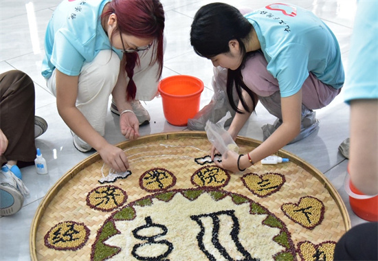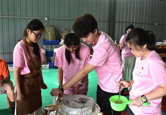 6月26日,實(shí)踐隊(duì)走進(jìn)流芳鄉(xiāng)開(kāi)啟非遺傳承實(shí)踐活動(dòng)。上午,隊(duì)員們運(yùn)用各類豆類原料進(jìn)行豆畫拼接創(chuàng)作,將經(jīng)濟(jì)學(xué)院院徽、美好愿景等元素融入作品,感受民間智慧與傳統(tǒng)技藝的創(chuàng)新融合。下午,隊(duì)員們走進(jìn)當(dāng)?shù)胤沁z工坊,親身體驗(yàn)豆腐制作全過(guò)程,從挑選黃豆到石磨磨漿再到柴火灶煮漿點(diǎn)鹵、壓制成型,在豆香四溢中領(lǐng)悟古法技藝的匠心傳承,探索非遺文化賦能鄉(xiāng)村振興的新路徑。