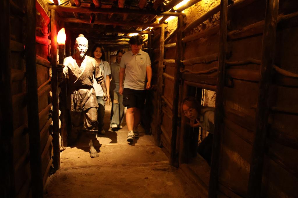 踏入瑞昌銅嶺銅礦考古遺址公園,實踐隊員們仿佛穿越時空隧道,置身于殷商先民的智慧世界。在專業講解員的引領下,昏暗的仿真巷道重現 “豎井下掘”、“木架支護” 的古老技藝——斑駁的巷道壁上,清晰可見石錘鑿刻的痕跡;陶制排水管道蜿蜒盤曲,訴說著先民應對地下開采難題的巧思;原始煉爐遺跡雖已沉寂千年,卻依然能讓人感受到當年火光沖天、銅液奔涌的壯觀場景。