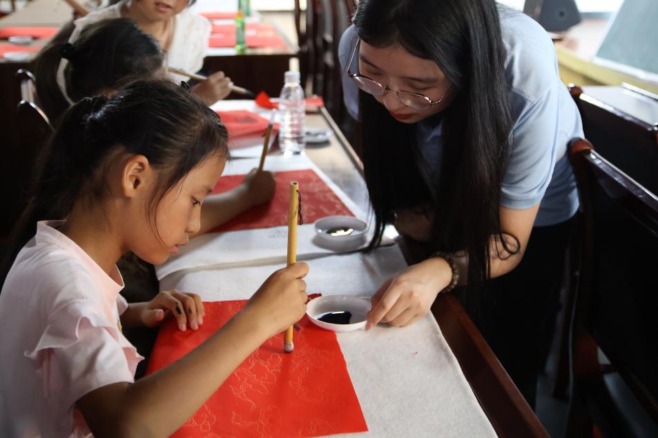實踐隊員們不僅是礦冶文化的探尋者,更是新時代文明的傳播者與鄉村振興的踐行者。他們走進當地實踐點,化身傳統文化導師,從書法基礎筆畫教學到特色 “福” 字書寫,從漆扇繪制到歷史故事分享,讓孩子們在趣味互動中感受中華優秀傳統文化的魅力,實踐隊還向實踐點贈送了書法作品;他們走上街頭巷尾,變身反詐宣傳員,通過典型案例剖析、反詐知識宣講和資料發放,切實提升群眾防范電信詐騙的意識和能力。