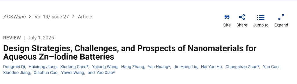 另外,陳修棟教授團(tuán)隊(duì)聯(lián)合培養(yǎng)研究生齊冬梅同學(xué)以第一作者身份、以九江學(xué)院為第一單位,在《ACS Nano》上發(fā)表題為“Design Strategies, Challenges, and Prospects of Nanomaterials for Aqueous Zn-Iodine Batteries”的綜述性學(xué)術(shù)論文。《ACS Nano》是美國(guó)化學(xué)會(huì)出版社旗下的納米科學(xué)與技術(shù)領(lǐng)域的頂級(jí)期刊,為Nature Index收錄期刊,中科院JCR分區(qū)為Top一區(qū),影響因子為15.9992。該期刊在納米科技領(lǐng)域具有重要地位,被廣泛認(rèn)為是該領(lǐng)域的權(quán)威期刊之一,其發(fā)表的文章往往代表了納米科學(xué)與技術(shù)領(lǐng)域的最新研究成果和發(fā)展方向,對(duì)推動(dòng)該領(lǐng)域的學(xué)術(shù)研究和技術(shù)創(chuàng)新具有重要作用,被業(yè)內(nèi)公認(rèn)為高學(xué)術(shù)質(zhì)量科技期刊。