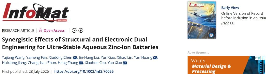 近日,在化學(xué)化工學(xué)院陳修棟教授團(tuán)隊(duì)的精心指導(dǎo)下,我校聯(lián)合培養(yǎng)研究生王亞江同學(xué)以第一作者身份、以九江學(xué)院為第一單位,在《InfoMat》(信息材料)上發(fā)表題為“Synergistic Effects of Structural and Electronic Dual Engineering for Ultra-Stable Aqueous Zinc-Ion Batteries”的學(xué)術(shù)論文。