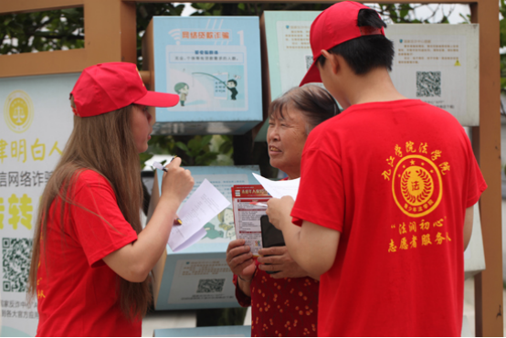 6月27日,服務隊走進共青城市金湖鄉和平村法治廣場,服務隊師生擺起了咨詢桌,一同為村民提供一對一的法律咨詢服務,耐心解答村民們的疑問,筑牢鄉村網絡法治防線。隊員們圍繞村民基本情況、網絡安全認知等方面提前設計問卷,在活動現場以問卷調查為載體開展網絡安全普法宣傳,結合實際案例講述防范要點,針對村民反映的問題借助情景模擬講解防范技巧。