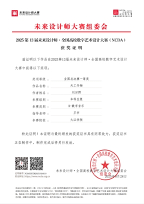 在此次NCDA大賽中,我校藝術學院在數字音樂相關的國家級重要賽事中再次實現顯著突破。電子音樂作品《天工開物》榮獲江西省賽區一等獎第一名,并一舉奪得全國一等獎,我校音樂學專業A2424班劉田野同學由此成功實現個人從省賽到國賽的“雙一等”優異成績。同時,九江學院成為該賽事數字音樂賽道中江西省首個問鼎全國最高獎的高校,充分展現了我校藝術學院基于OBE理念培養學生實踐創新能力的卓越成效。