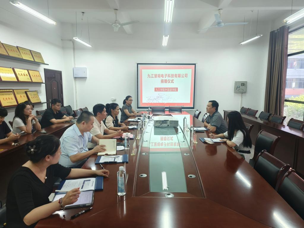 捐贈(zèng)儀式上,九江慧明電子科技有限公司董事長(zhǎng)唐曉明、董事長(zhǎng)助理魏小雙,以及外國(guó)語(yǔ)學(xué)院黨政班子、部分教師代表共同出席。