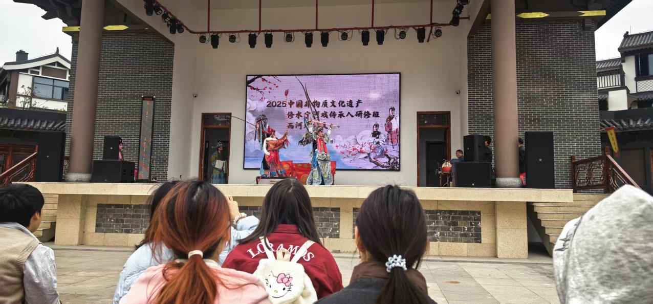 上午10點,師生抵達古城。該地屬于廬山市旅游示范點,致力于將傳統戲曲文化與現代旅游產業深度融合,旨在為游客提供獨具特色的觀戲體驗與高品質旅游服務。在古城戲臺,學員們觀賞到原汁原味的西河戲傳統劇目表演。演員們身著古韻十足的戲服,以惟妙惟肖的演繹,吸引了全場目光,贏得一致稱贊。學員們沉浸在唱念做打的精彩之中,深深折服于傳統戲曲藝術的獨特魅力。
