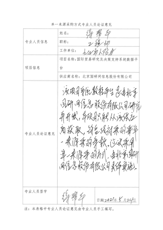 采用單一來源采購方式的原因及說明:”國際貿(mào)易研究及決策支持系統(tǒng)數(shù)據(jù)平臺“項目是由北京國研網(wǎng)信息股份有限公司自主研發(fā),符合政府采購單一來源采購情形,為此建議采用單一來源采購方式,由北京國研網(wǎng)信息股份有限公司具體實施。