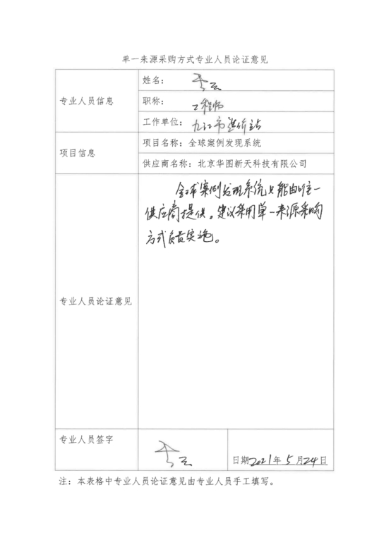 采用單一來源采購方式的原因及說明:本系統軟件由北京華圖新天科技有限公司自主研發,為此該項目只能由北京華圖新天科技有限公司提供,建議采用單一來源采購方式,由北京華圖新天科技有限公司負責實施。