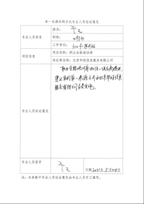 采用單一來源采購方式的原因及說明:本項目“職業全能培訓庫”是由北京華炬信息服務有限公司自主研發,為此該軟件只能由北京華炬信息服務有限公司提供,建議采用單一來源采購方式,由北京華炬信息服務有限公司具體實施。