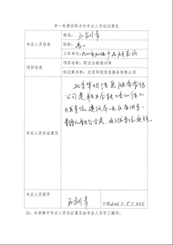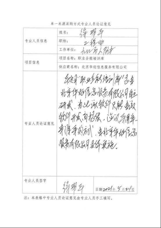 ????本項目“職業全能培訓庫”是由北京華炬信息服務有限公司自主研發,為此該軟件只能由北京華炬信息服務有限公司提供,建議采用單一來源采購方式,由北京華炬信息服務有限公司具體實施。